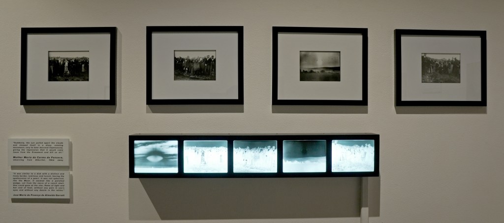 Witness testimony is displayed on wall text alongside the images, contextualizing what we see and assisting in the development of a chronological narrative. For those viewers who are unfamiliar with the Fatima event, they will be challenged into thinking that this is all a made-up narrative, and yet, the images appear photo real. Any internet research will produce some of the images seen in the gallery alongside the voluminous histories written about the event. How does one then make sense of those images that intellectual reasoning tells them must be impossible, such as the rose petal shower and the sun “dancing in the sky?”