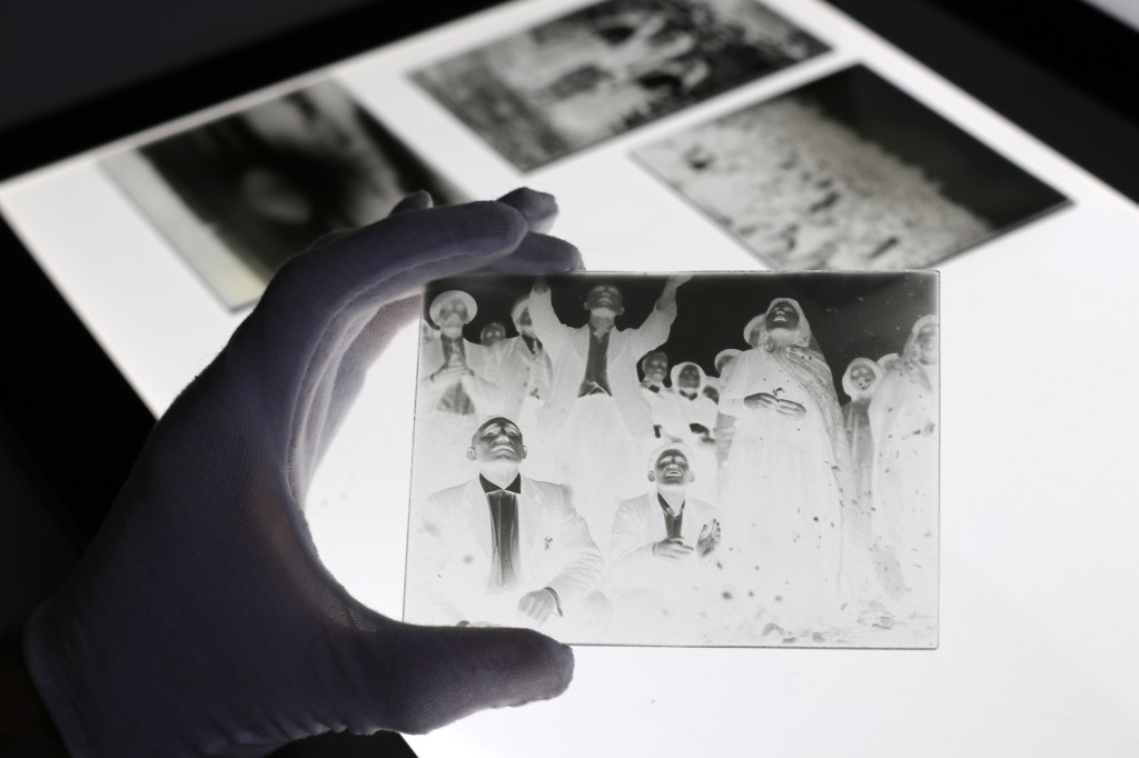 In order to do this, I’ve deliberately constructed the presentation of the Fatima images in my exhibition. The viewer enters the gallery with a statement that reads, “I have no intention of misleading or deceiving you. These things happened.” They are already primed to question if what they are experiencing is true. Upon being confronted with backlit glass plate negatives and positive prints framed to appear in museum curatorial fashion, they must question the images’ relationship to one another. The aesthetics of credibility on display suggest that these are originals and that one is produced from the other. A wall text states that they are the product of Judah Bento Ruah, a photojournalist on assignment from a Portuguese newspaper.