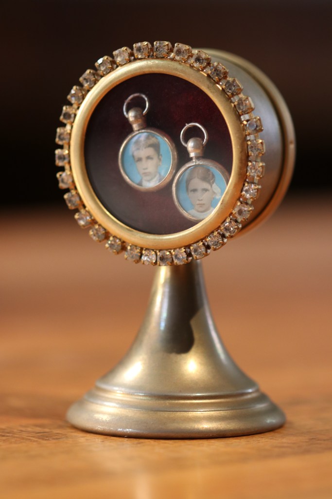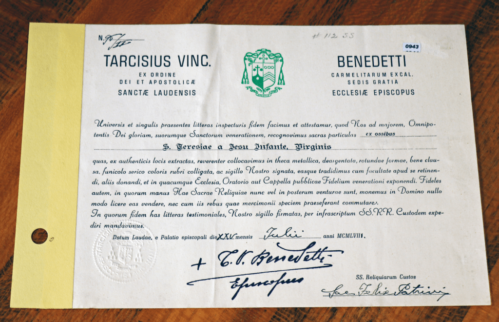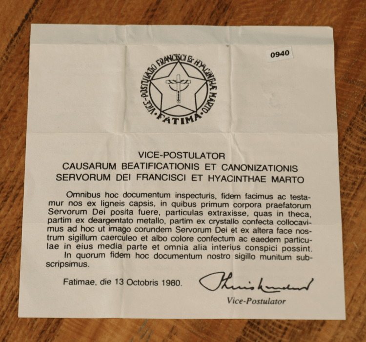 It’s for these reasons that the contemporary saints I was seeking to encounter had extremely good provenance documents, which are displayed in my exhibition per Canon Law. Therese of Lisieux’s relic is a bone fragment, an authentic first-class relic, whereas Jacinta and Francisco Marto’s relics are pieces of their wood casket and therefore third-class relics, enclosed beneath images of the saints.