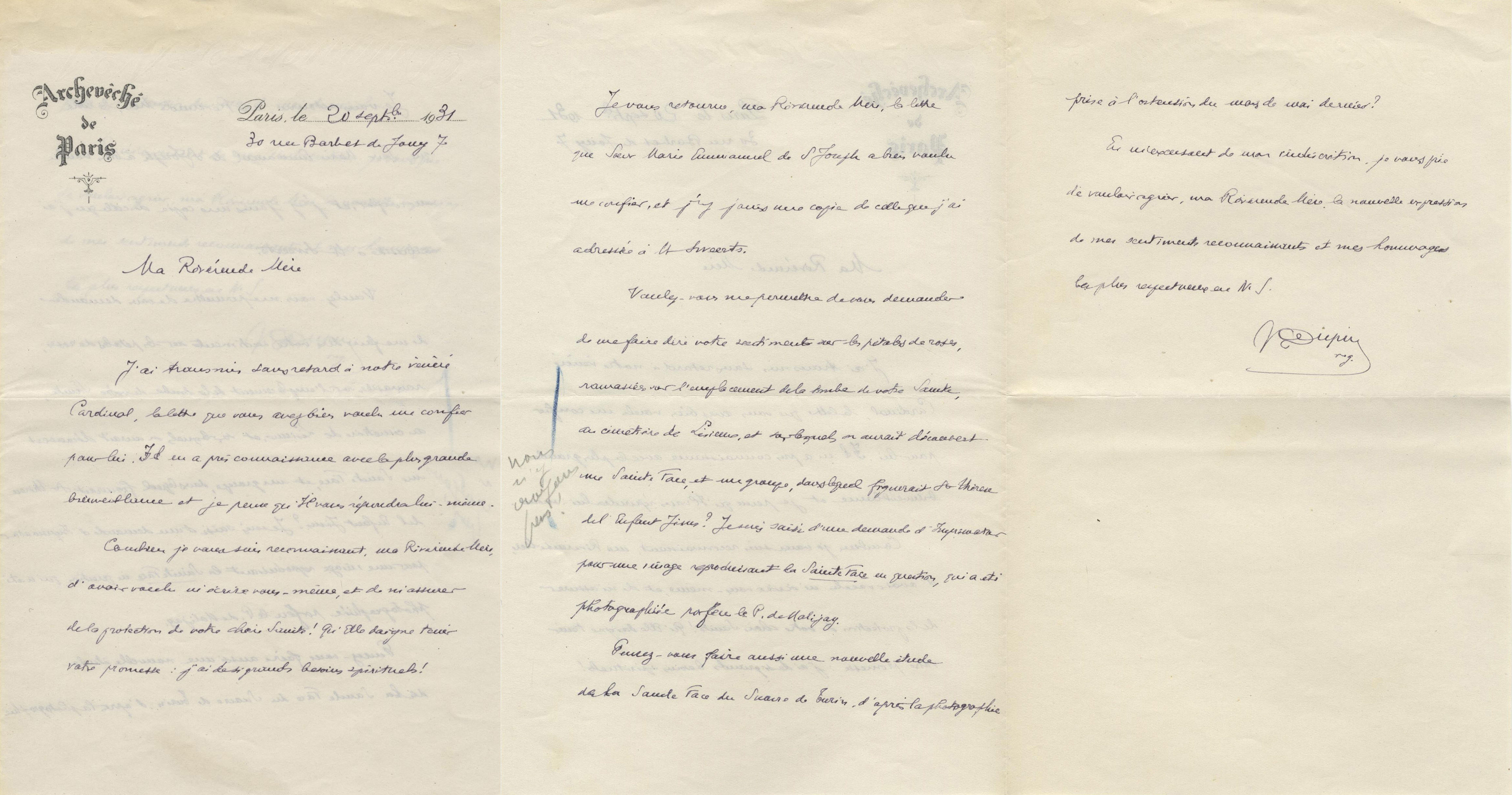 According to the archive, Bishop Victor Dupin wrote to Mother Agnes of Jesus, the Prioress of the Carmelite monastery and Therese’s sister, on September 20th, 1931. Dupin explains that he was asked for an imprimatur by the writers of the pamphlet, a kind of “seal-of-approval” that would certify that it contained no doctrinal issues. However, within the margins of the letter is a post-script, written in pencil, which says, “We don’t believe it!” The archive explained to me that we don’t know if or what Mother Agnes replied, but it appears that Bishop Dupin signed the imprimatur anyway. Otherwise, any information on the whereabouts of the petal or images in question seems to be lost to time.